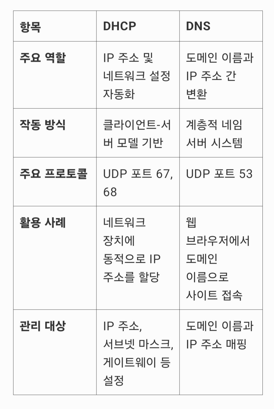 DHCP와 DNS는 각각 네트워크 연결과 접근성을 지원하는 핵심 프로토콜입니다.